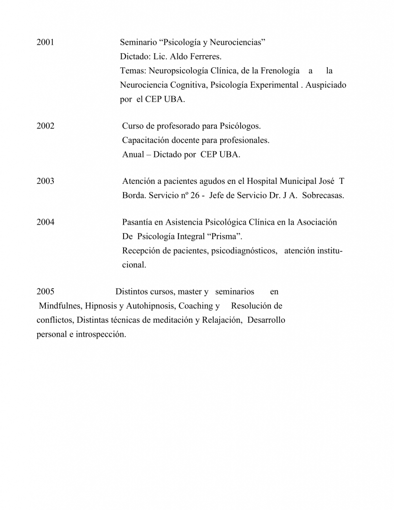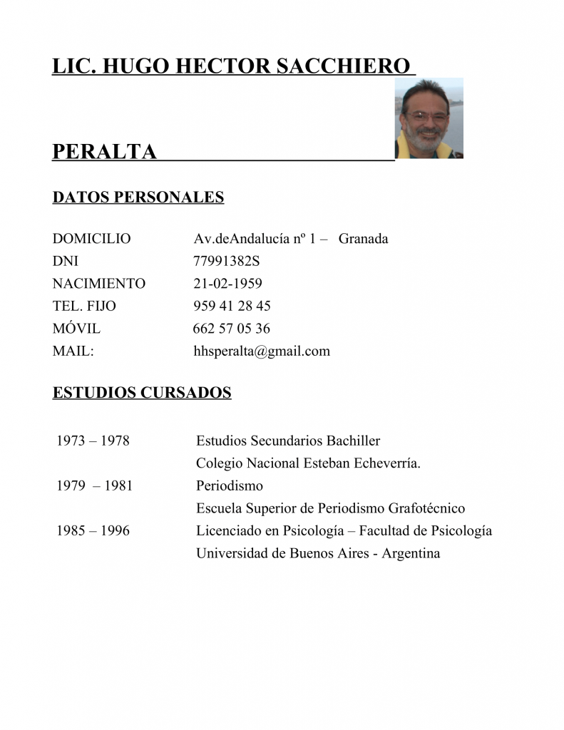 Mi nombre es Hugo Héctor Sacchiero Peralta, soy licenciado en psicología , por la facultad de psicología de la universidad de Buenos Aires («UBA»), Argentina, con matrícula Nacional no 25609, colegiado no 32365, desde la década de los años 90.